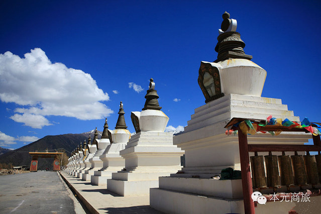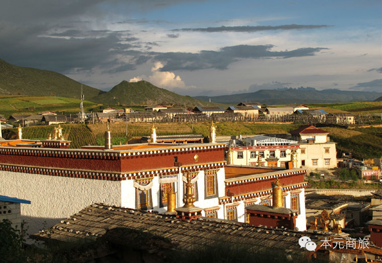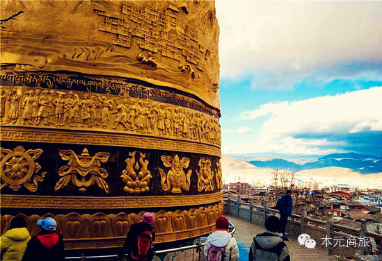 中午回到县城里面用完中餐后,准备去游览松赞林寺。到达香格里拉,站在中甸县城的制高点,向北望去,晴朗的天空下,宽阔的草原尽头,有一片集镇规模的建筑群铺撒于群山间,鎏金铜瓦闪闪发光,这片像极了古堡群似的古老而辉煌的建筑,就是云南省最大的藏传佛教寺院——葛丹松赞林寺。
